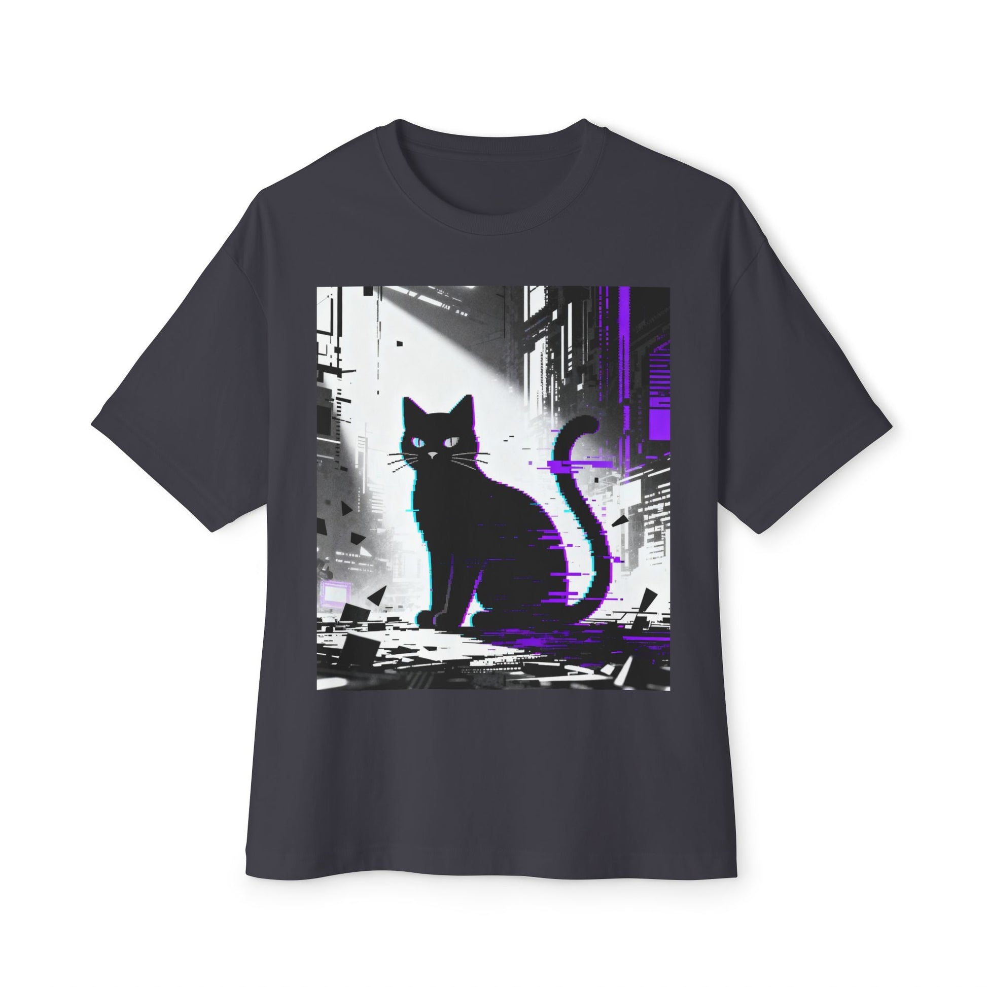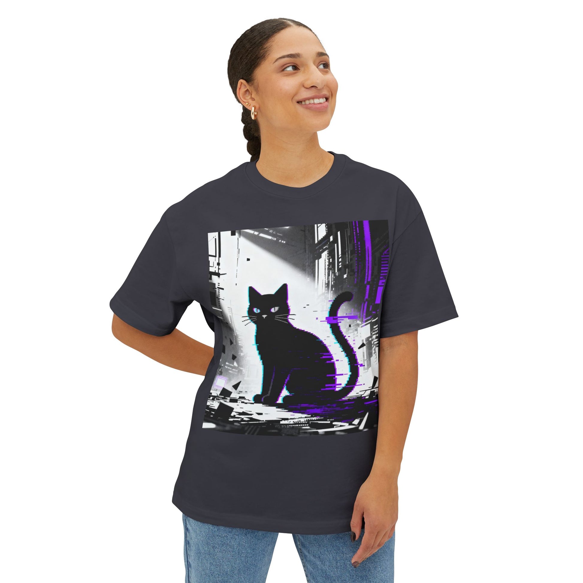 A boxy, relaxed tee that carries a quiet, electric mood. The front shows a silhouette of a watchful cat set against a neon-tinged cityscape — moments of stillness framed by urban glow. Wear it when you want to move through the city with a little mystery: morning coffee runs, late-night walks, or an art crawl. The oversized cut drops at the shoulders for an easy silhouette that layers smoothly over hoodies or under structured coats. The medium-weight cotton feels substantial without being stiff, and thoughtful details like double-stitched hems and a tear-away label keep the focus on comfort and the design. This is a shirt for people who like their style to hint at stories — a little nocturnal, a little retro-future, and quietly confident.