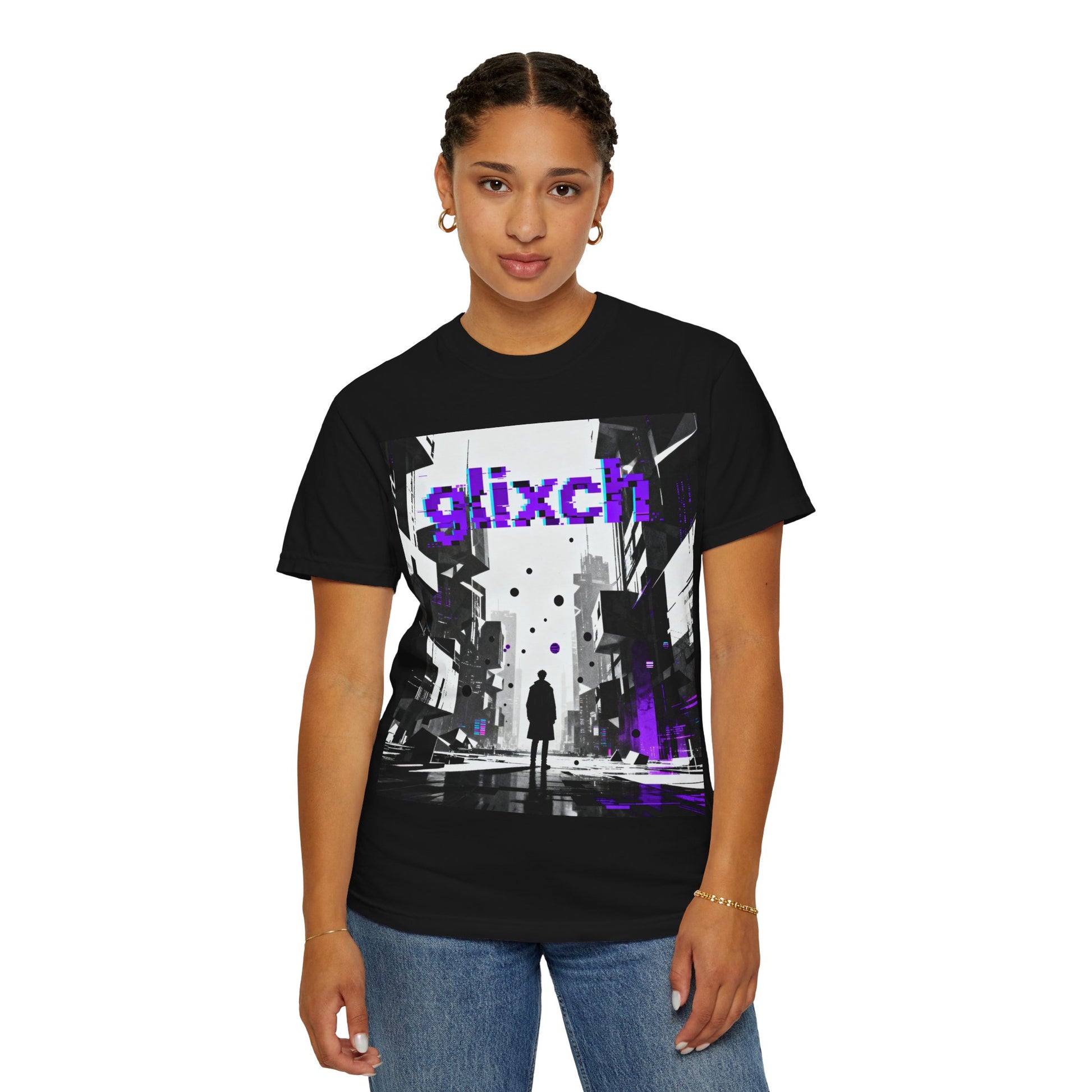 A garment-dyed cotton tee with a moody, cyber-noir graphic that feels like a midnight walk through a city caught between reality and a digital glitch. The front features a high-contrast black-and-white street scene, punctuated by purple pixelated text and floating dots that give the design a fractured, futuristic energy. The medium-weight fabric softens with wear, the relaxed fit drapes easily, and the tubular, seam-free body keeps the silhouette clean. Wear it when you want streetwise style that reads as thoughtful and a little rebellious — a quiet statement for late-night city strolls, underground shows, or coffee-shop sketch sessions.